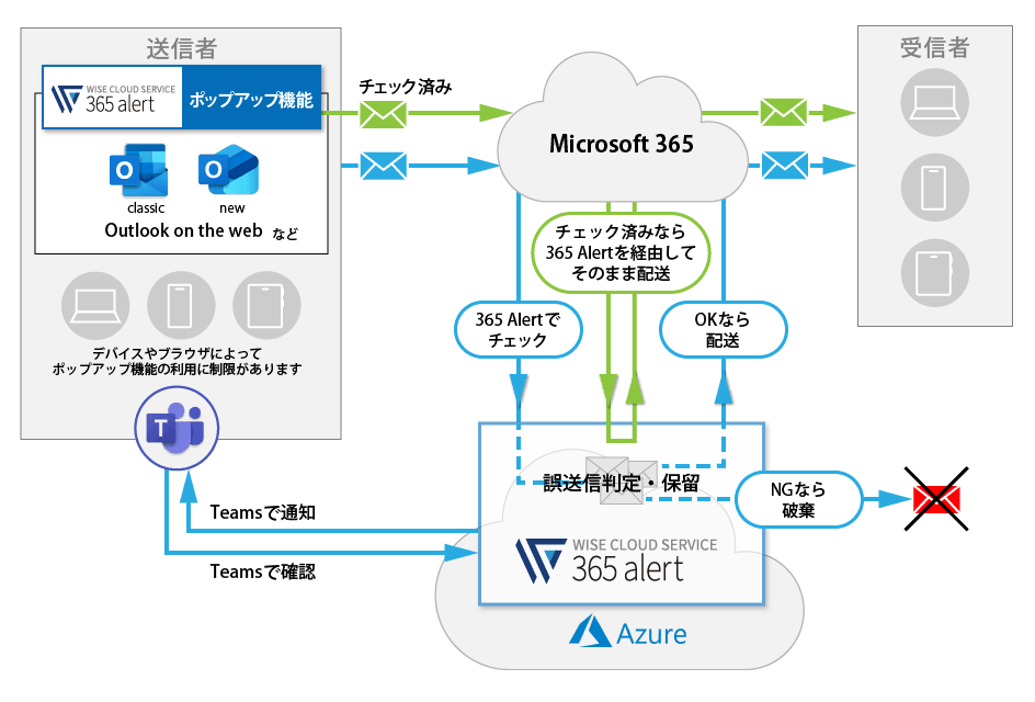 365 Alertは、以下の2種類の仕組みによって誤送信対策を行います。