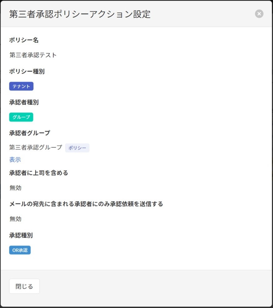 2. 以下の画面が表示されますので、[適用ポリシー]項目に、「名前 種別 アクション」の形式で表示されている適用されたポリシーの中から アクション第三者承認 の行を探し、名前種別 を取得します。