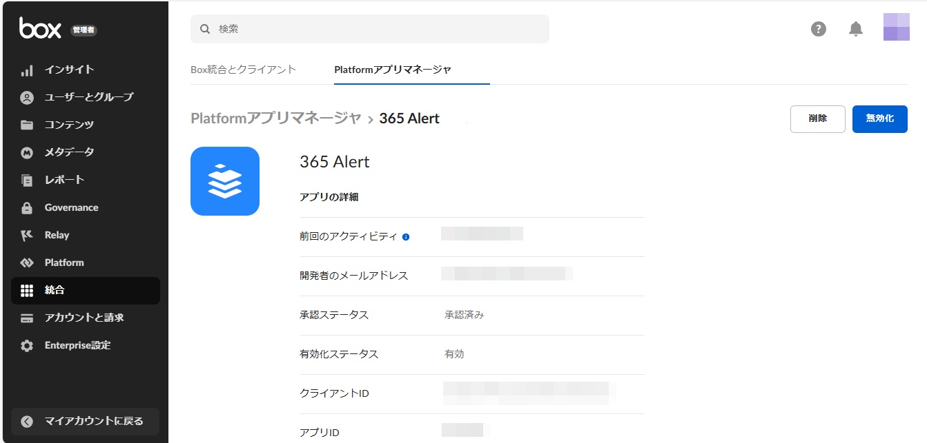 以下の画面で365 Alertアプリの詳細情報が表示されますので、この情報をBoxのサポートに渡して365 Alertアプリを削除してもらってください。