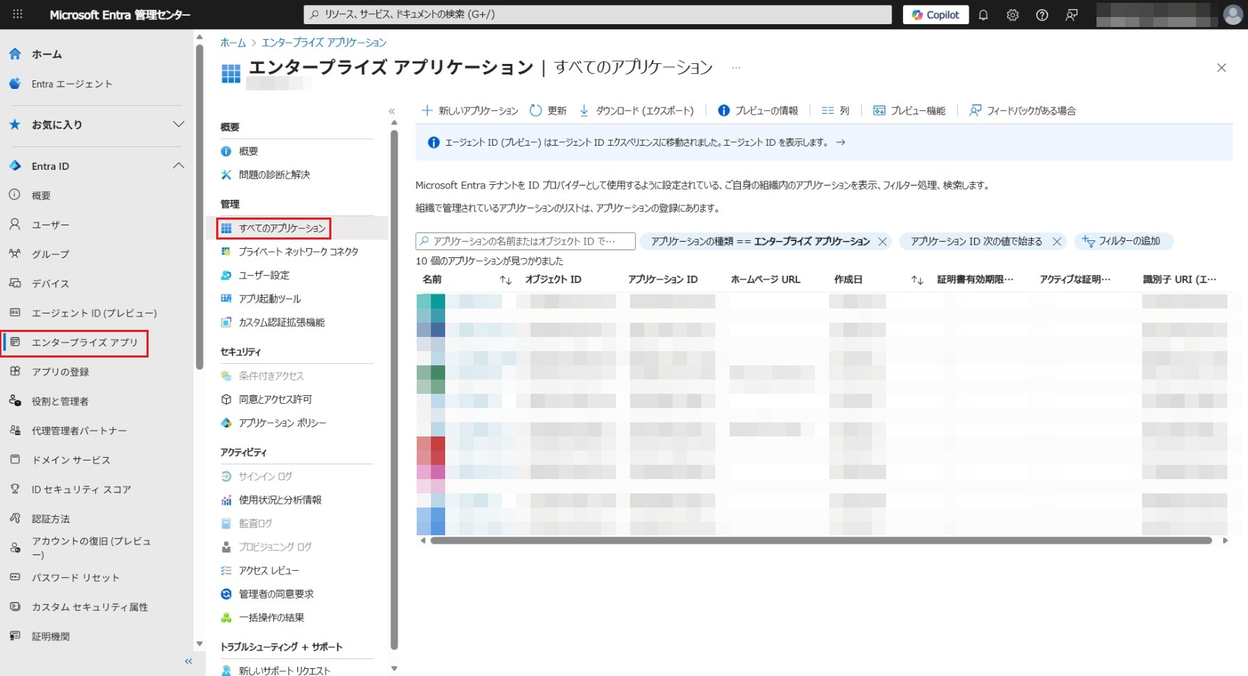 画面左のメニューから[エンタープライズ アプリケーション]をクリックして表示された画面で[管理]>[すべてのアプリケーション]をクリックします。