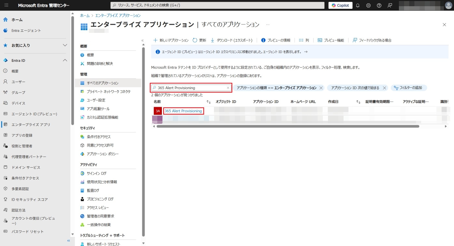 365 Alert Provisioningと入力して、表示された[365 Alert Provisioning]をクリックします。