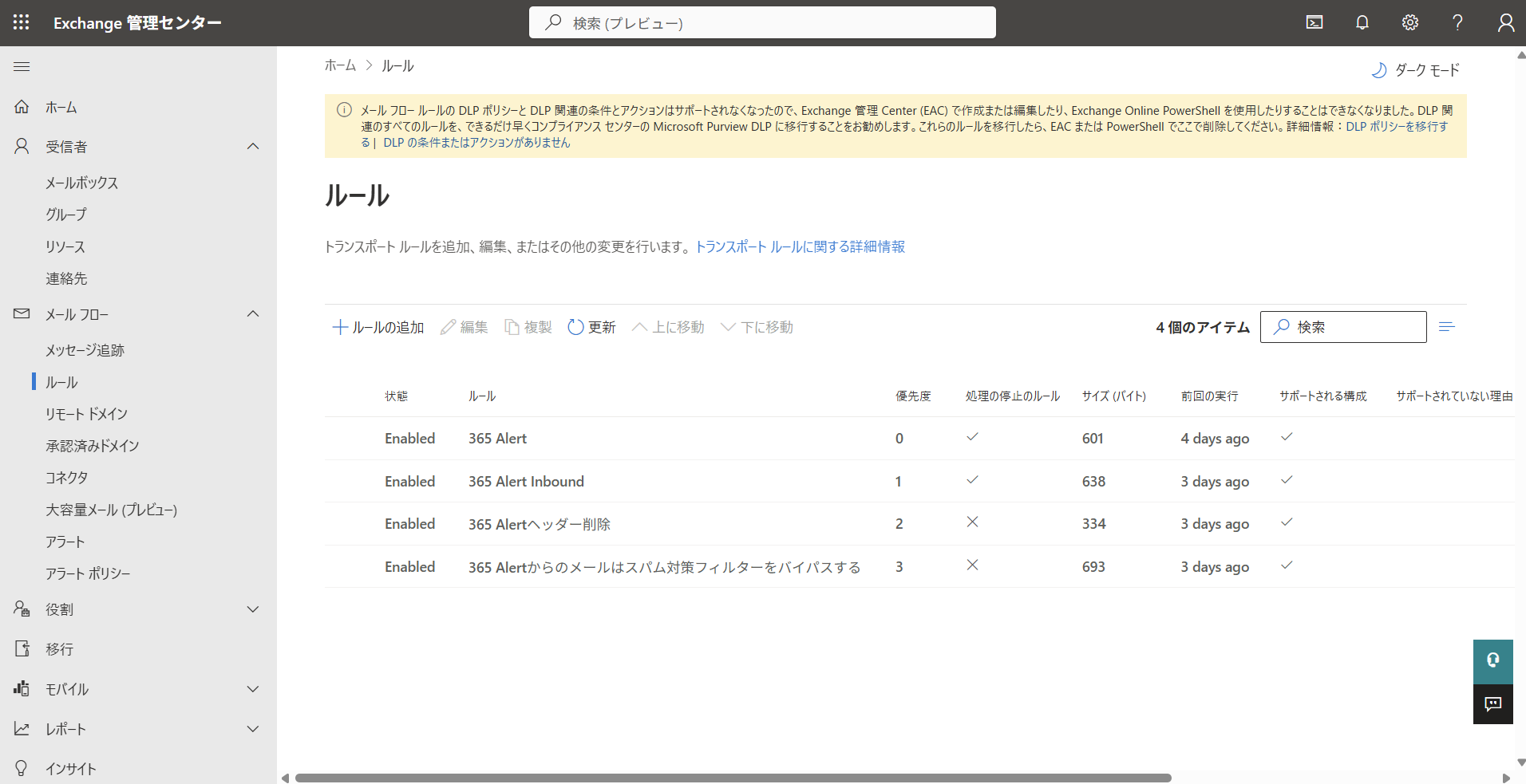7. メールフロールールの優先度を参照して365 Alertヘッダー削除メールフロールールの優先度を調整してください。
