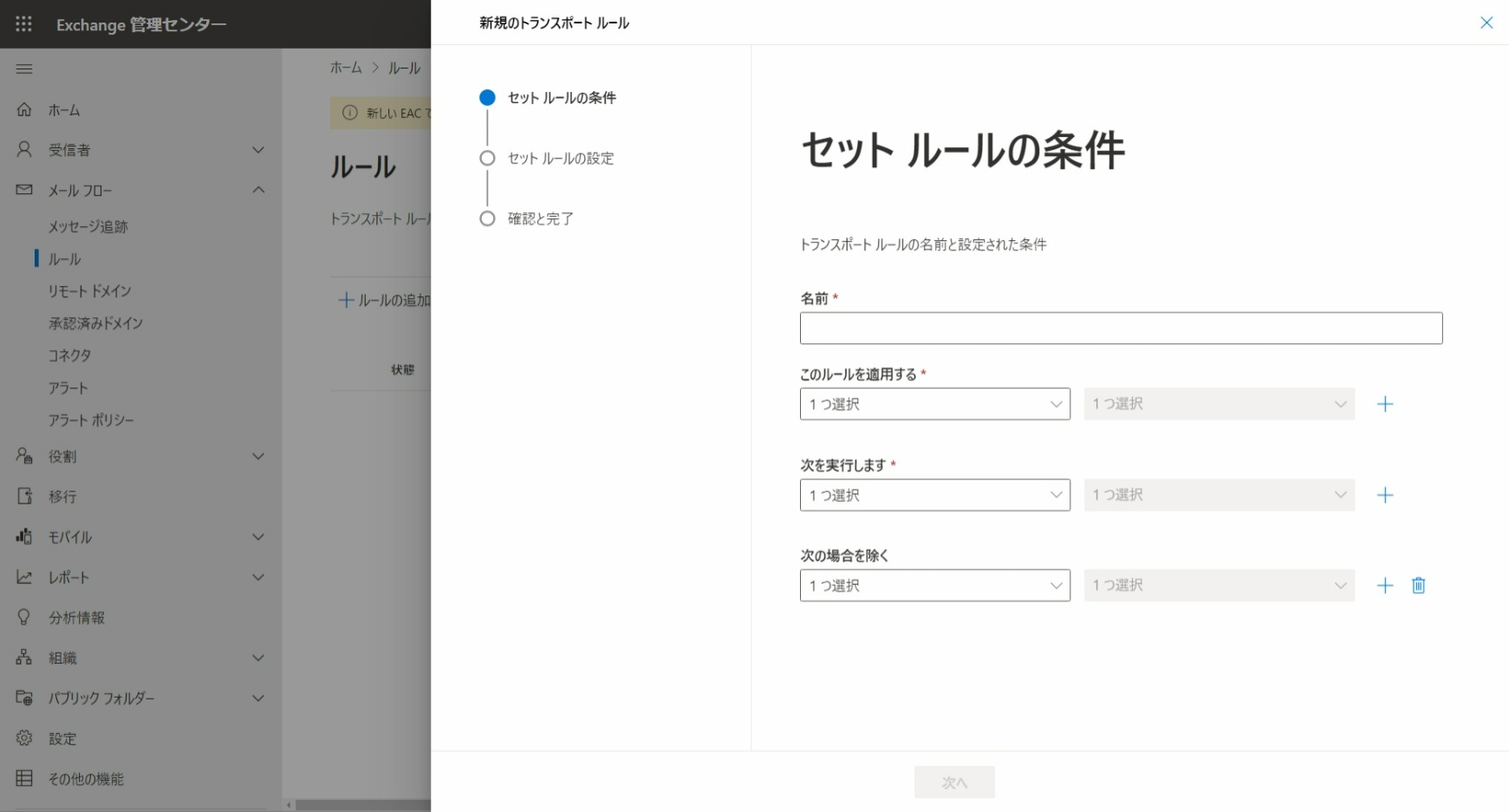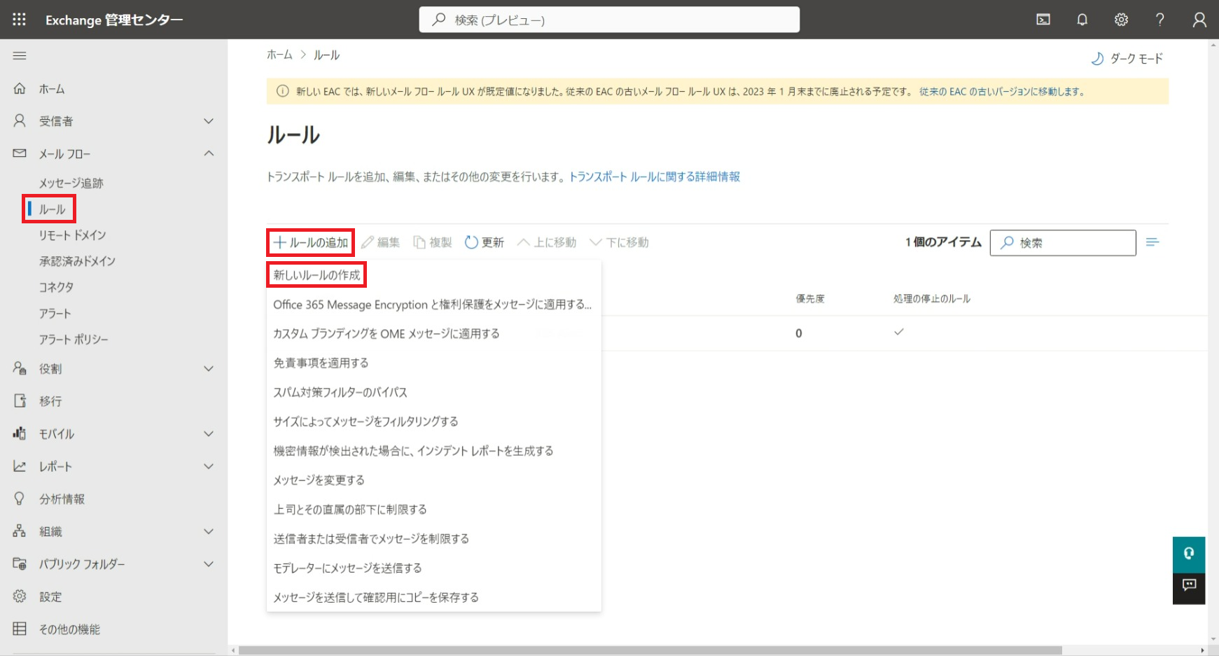2. 画面左のメニューから[メールフロー]>[ルール]をクリックします。表示された画面で[+ルールの追加]をクリックし、[新しいルールの作成]を選択します。