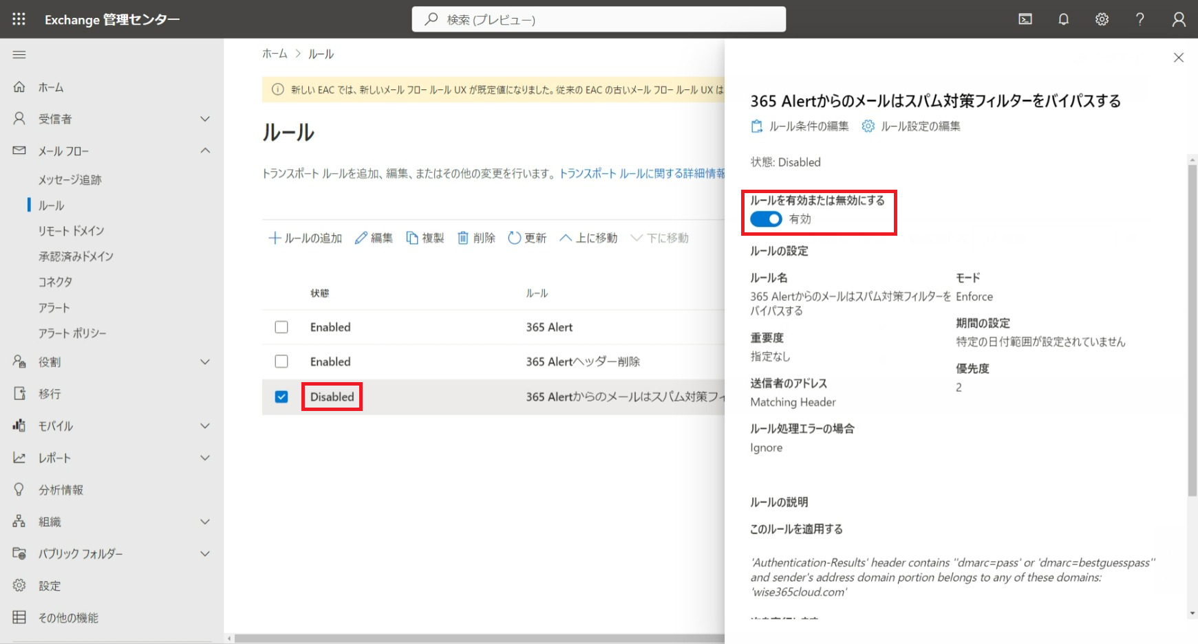 以上で、365 Alertからのメールはスパム対策フィルターをバイパスするメールフロールールの作成は完了です。