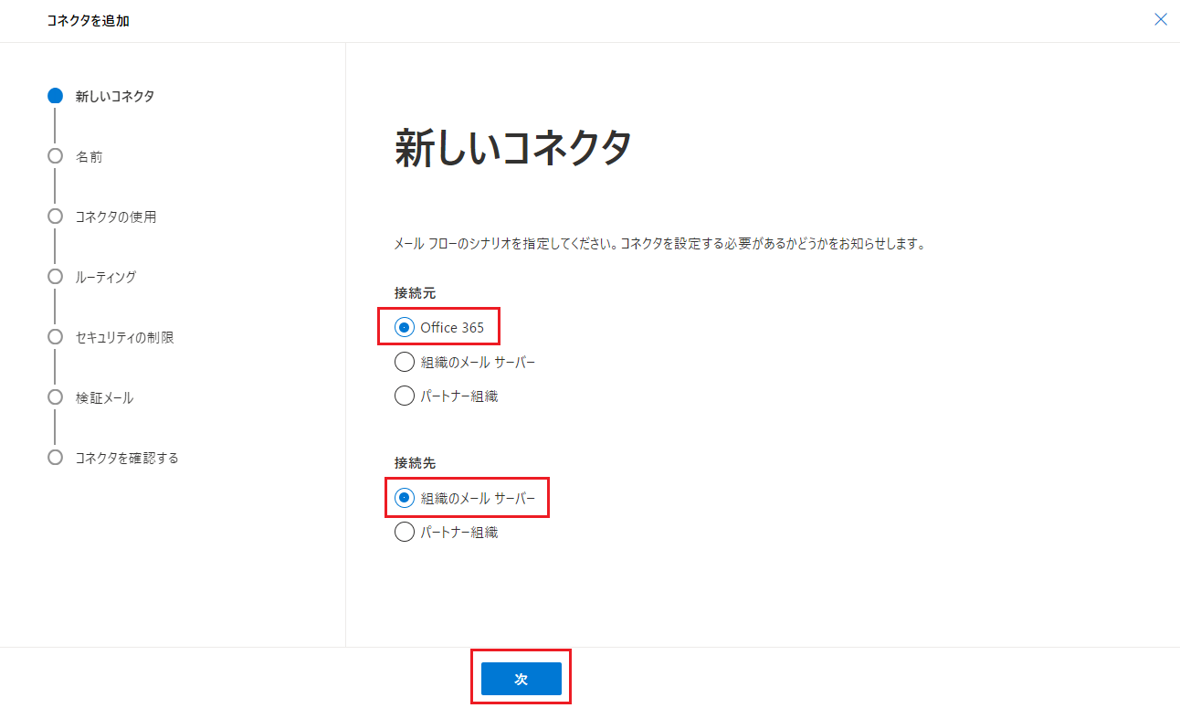 3. コネクタの新規作成ウィザードが表示されます。次に示すメールフローのシナリオを設定し、[次]をクリックします。