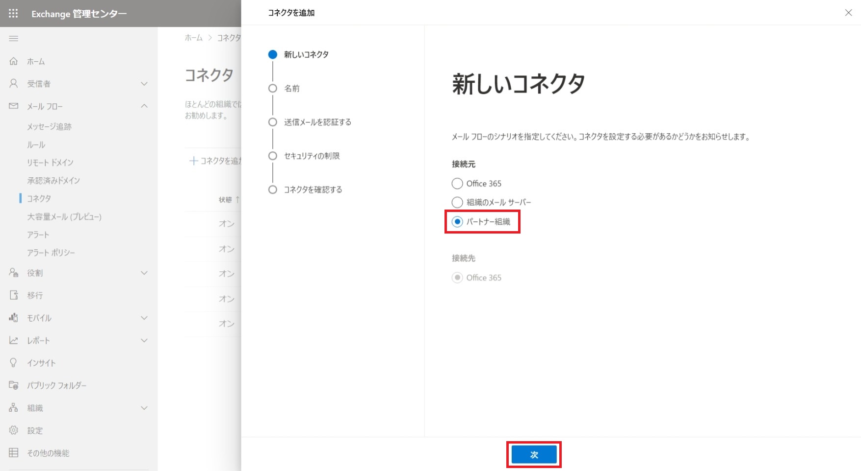 3. コネクタの新規作成ウィザードが表示されます。接続元として[パートナー組織]を選択し、[次]をクリックします。