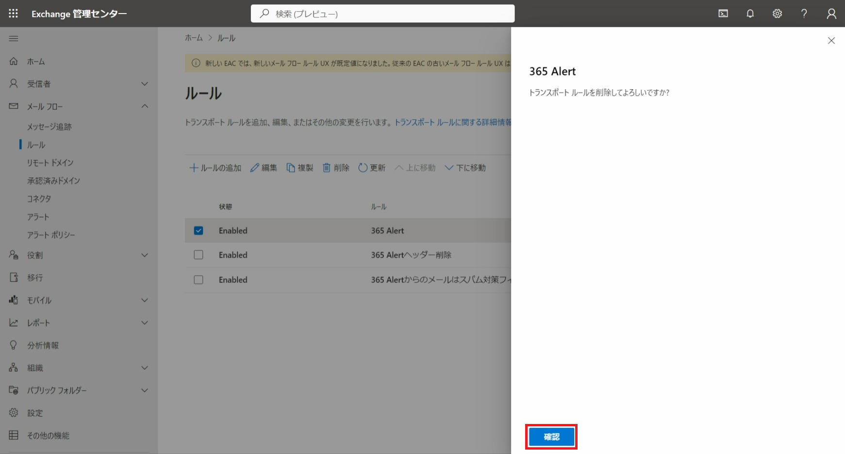 以下では、365 Alertで使用するExchange Onlineのメールフロールールとコネクタの設定を削除する手順を記載します。