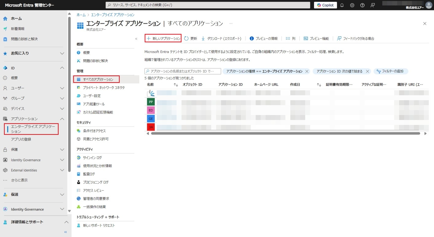 画面左のメニューから[アプリケーション]>[エンタープライズ アプリケーション]の順にクリックします。表示された画面で[管理]>[すべてのアプリケーション]をクリックし表示された画面で[+新しいアプリケーション]をクリックします。