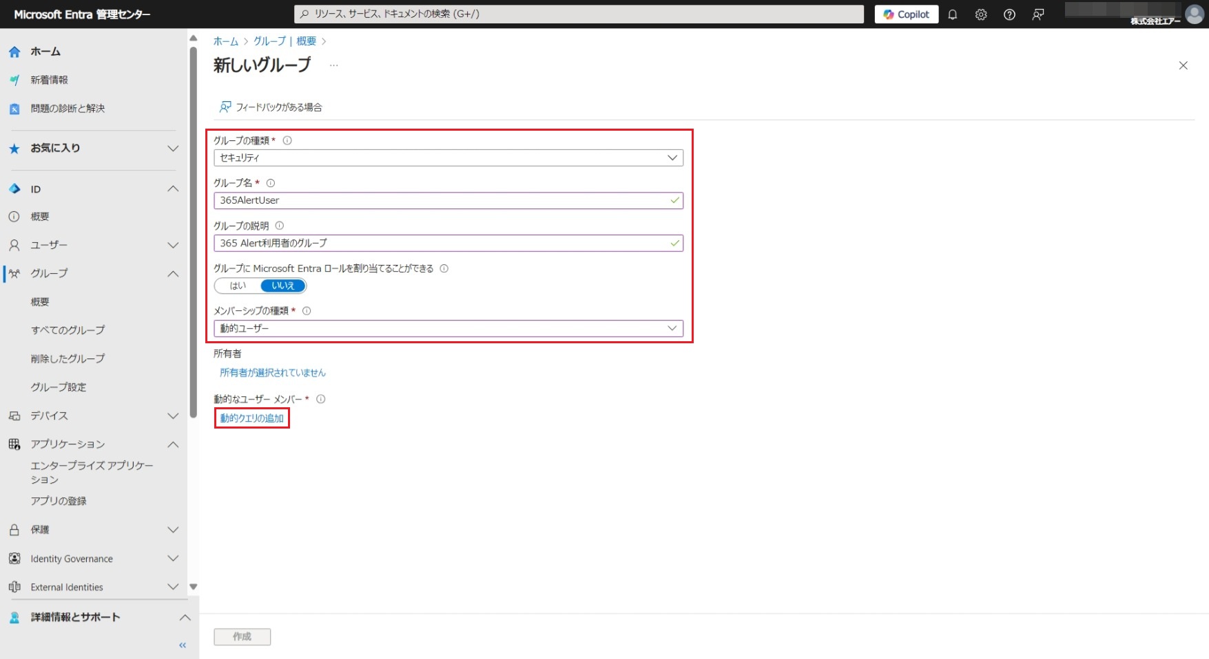 以下では、動的グループを使用して、自動で365 Alertに同期するユーザーを割り当てる方法を記載します。