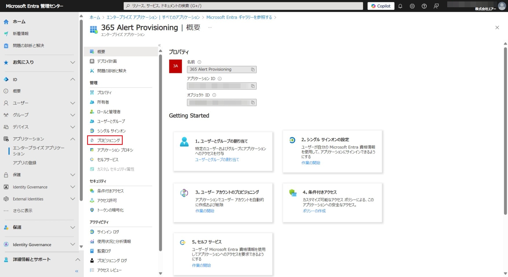 - Microsoft Entra ID(旧称Azure AD)に自動プロビジョニング用のアプリ(アプリ名は365 Alert Provisioning)を登録し、365 Alert Provisioningアプリに対する自動プロビジョニングの設定を行います。