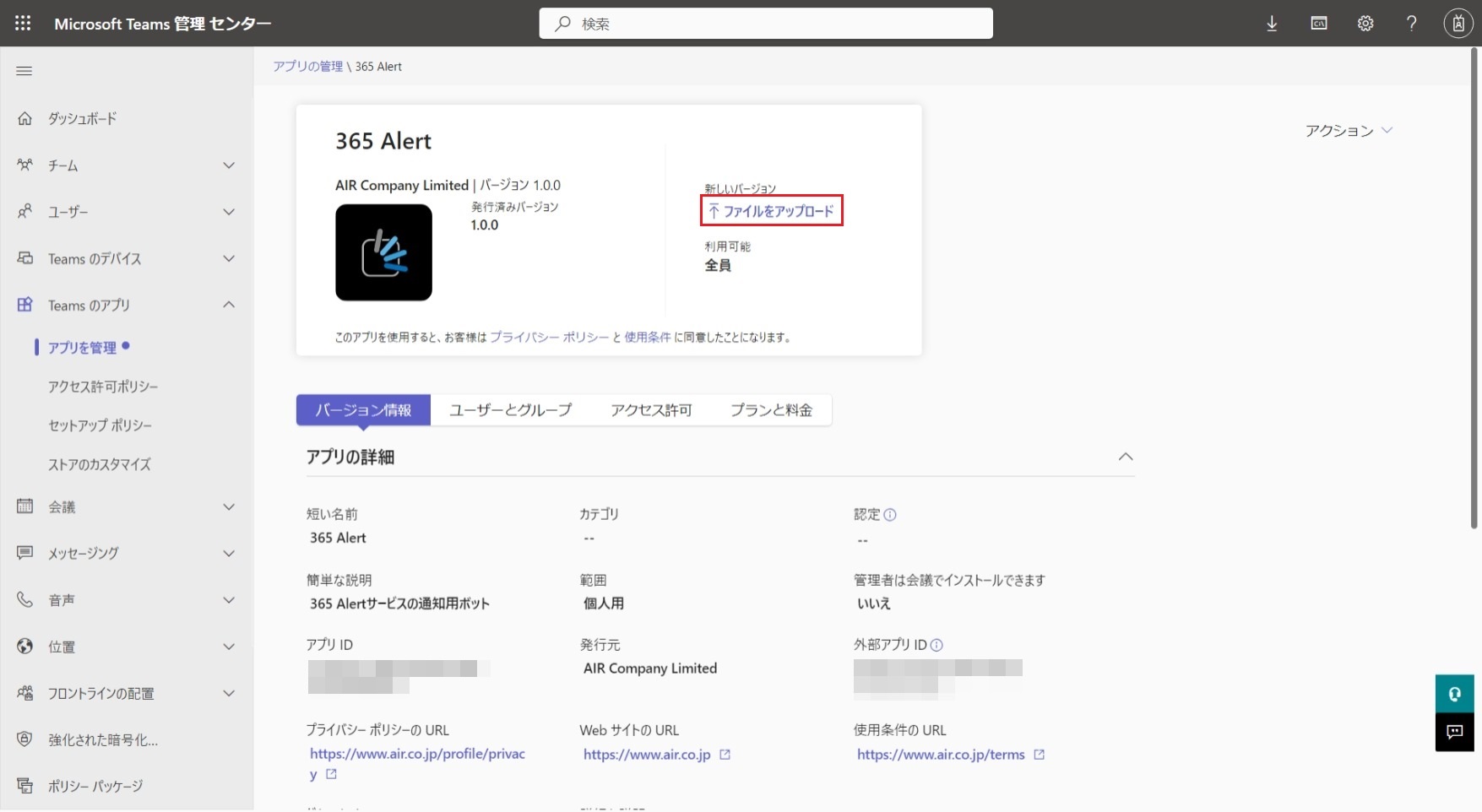 ユーザーがTeams通知を受け取るためのアプリをインストール出来るように、Microsoft Teams管理センターで365 Alertアプリのアップロードを行います。
