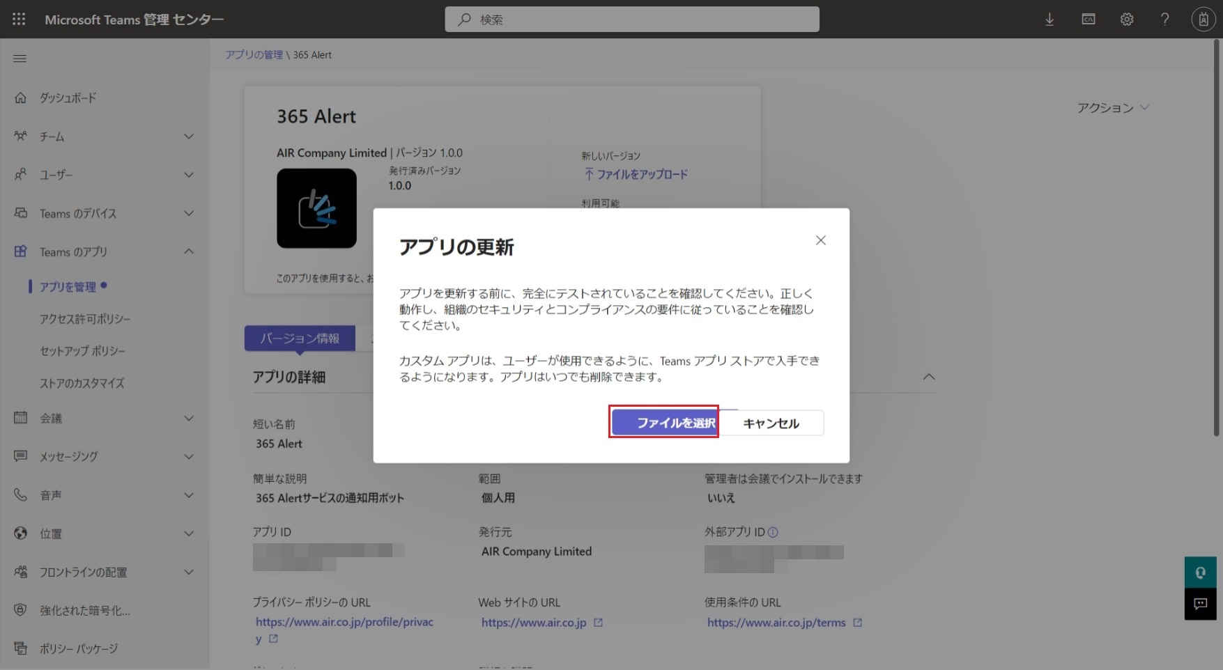 以下の画面で、[ファイルを選択]をクリックし、「365AlertApp-X.X.X.zip」を選択して、[開く]をクリックします。