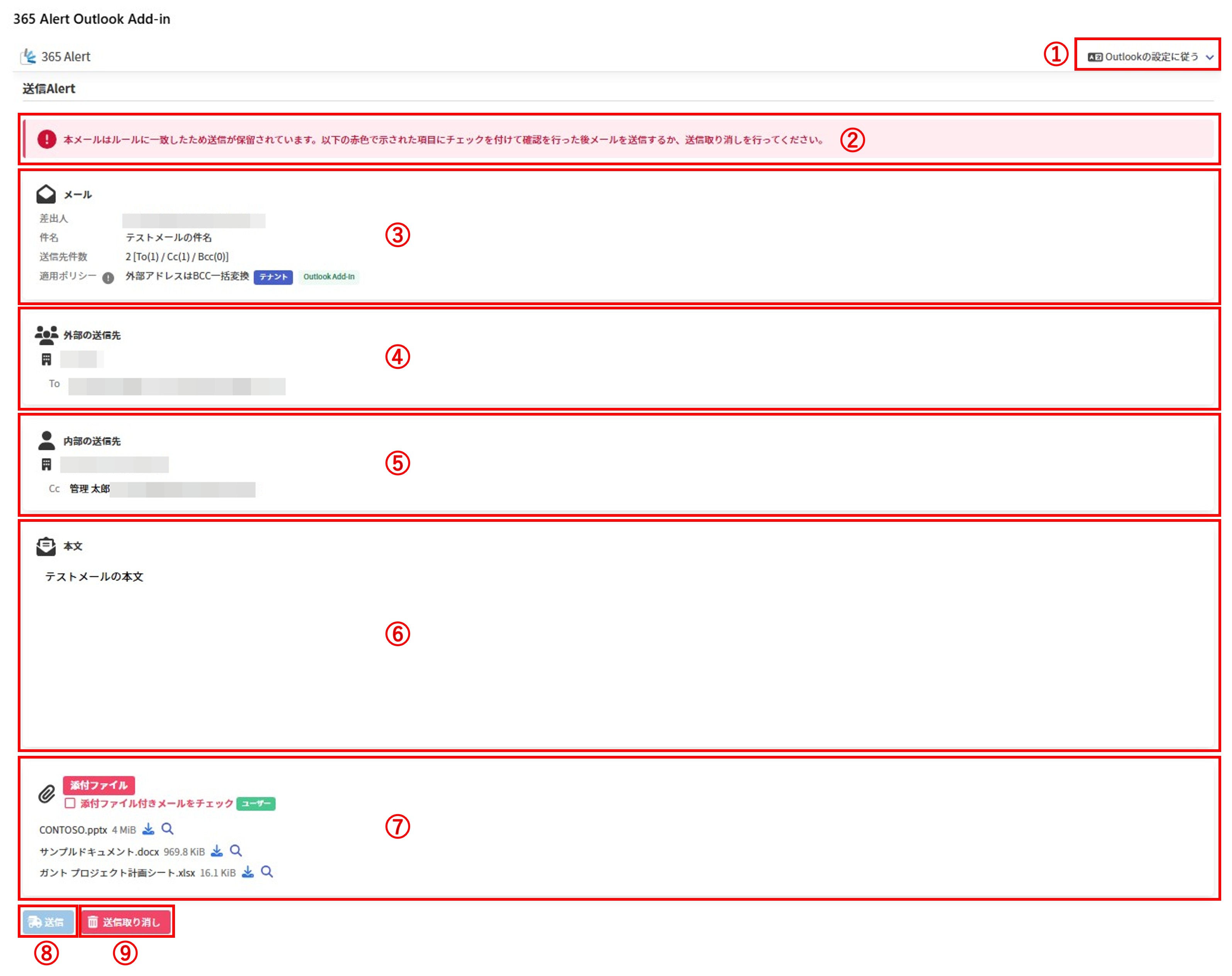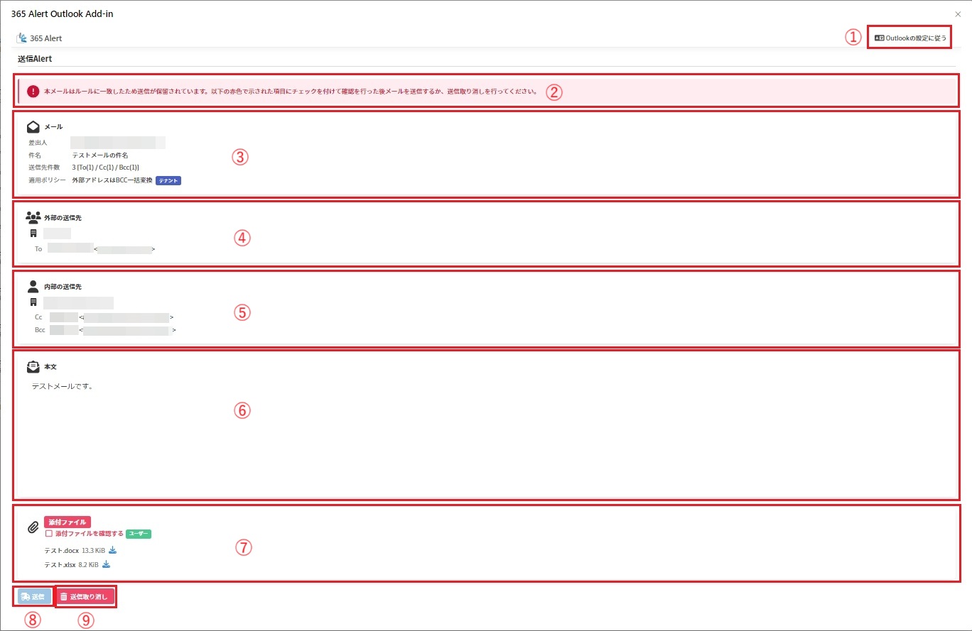 | タイトル | 外 部の送信先セクションのタイトルです。 | 送信先に外部ドメインを含む送信先に複数の外部ドメイン名を含む送信先がすべて外部ドメイン(送信者を除く) |