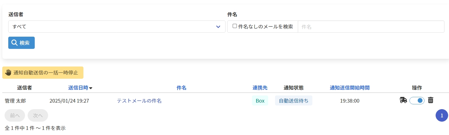 [通知自動送信の一括一時停止]をクリックして[通知状態]が自動送信待ちの全共有リンクパスワード通知の自動送信を一時停止し自動送信一時停止状態に変更します。
