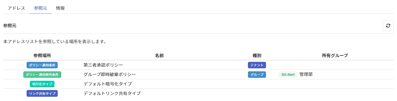 | 3 | 種別 | アドレスリストを参照しているポリシーの種別です。こちらの[適用範囲]を参照してください。 ※ 本項目は[参照場所]が ポリシー適用条件またはポリシー適用除外条件の場合に表示されます。 |