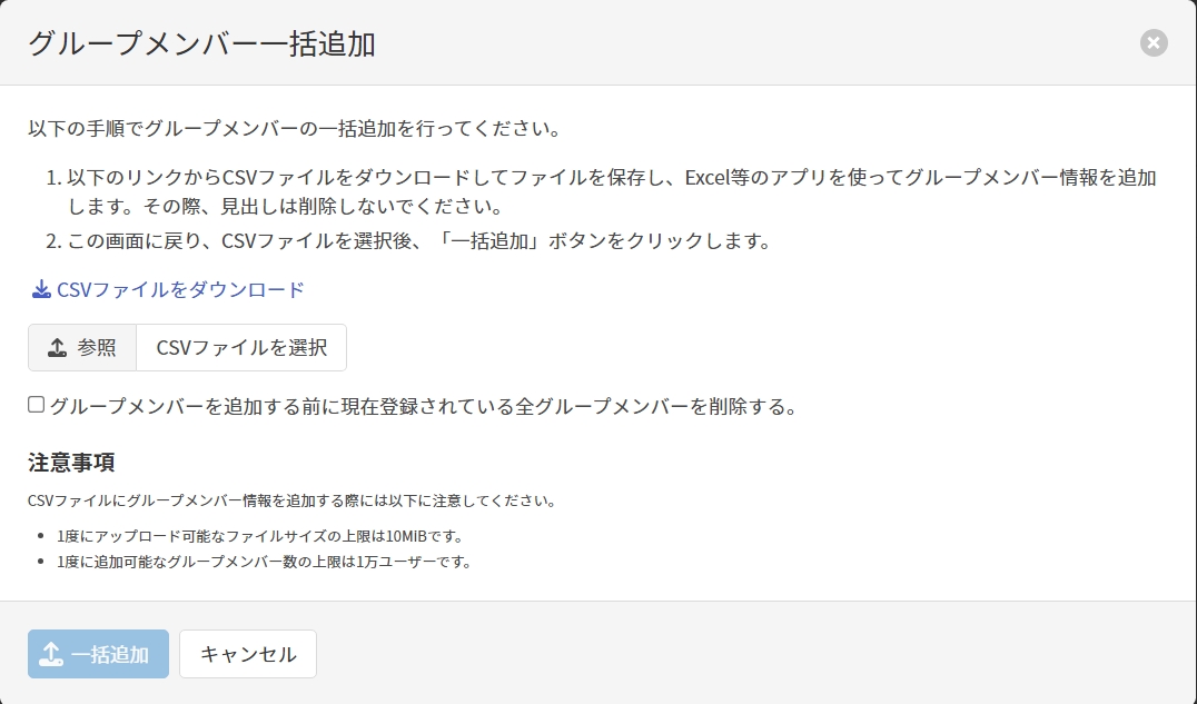 | CSVファイルを選択 | [CSVファイルをダウンロード]リンクをクリックしてダウンロードしたCSVファイルにグループメンバー情報を追加したものを選択します。 CSVファイルのフォーマットは一括追加で使用するCSVファイルのフォーマットを参照してください。 |
