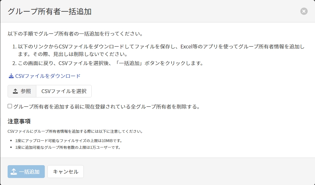 | CSVファイルを選択 | [CSVファイルをダウンロード]リンクをクリックしてダウンロードしたCSVファイルにグループ所有者情報を追加したものを選択します。 CSVファイルのフォーマットは一括追加で使用するCSVファイルのフォーマットを参照してください。 |