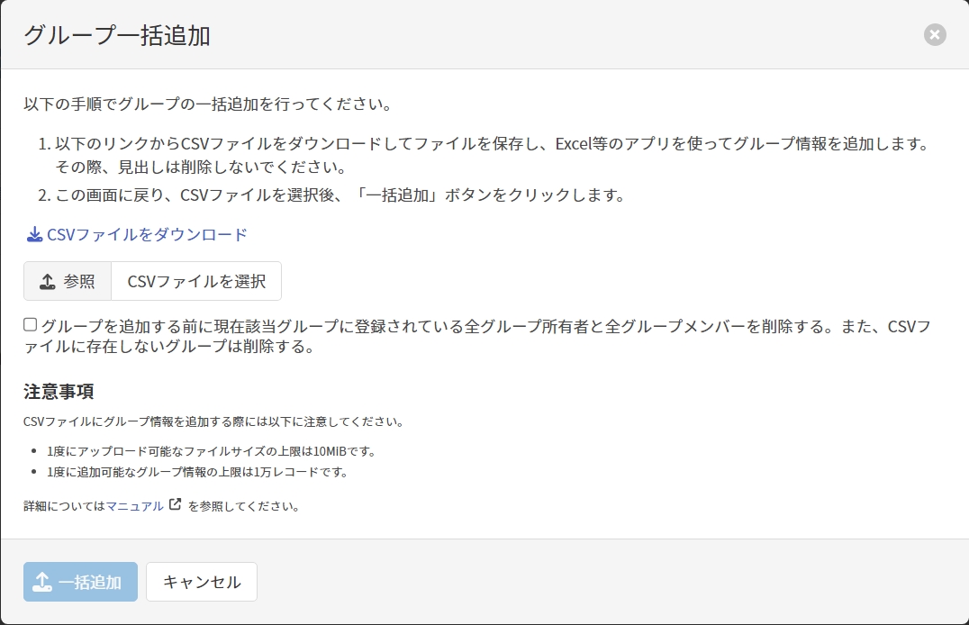 | CSVファイルを選択 | [CSVファイルをダウンロード]リンクをクリックしてダウンロードしたCSVファイルにグループ情報を追加したものを選択します。 CSVファイルのフォーマットは一括追加で使用するCSVファイルのフォーマットを参照してください。 |