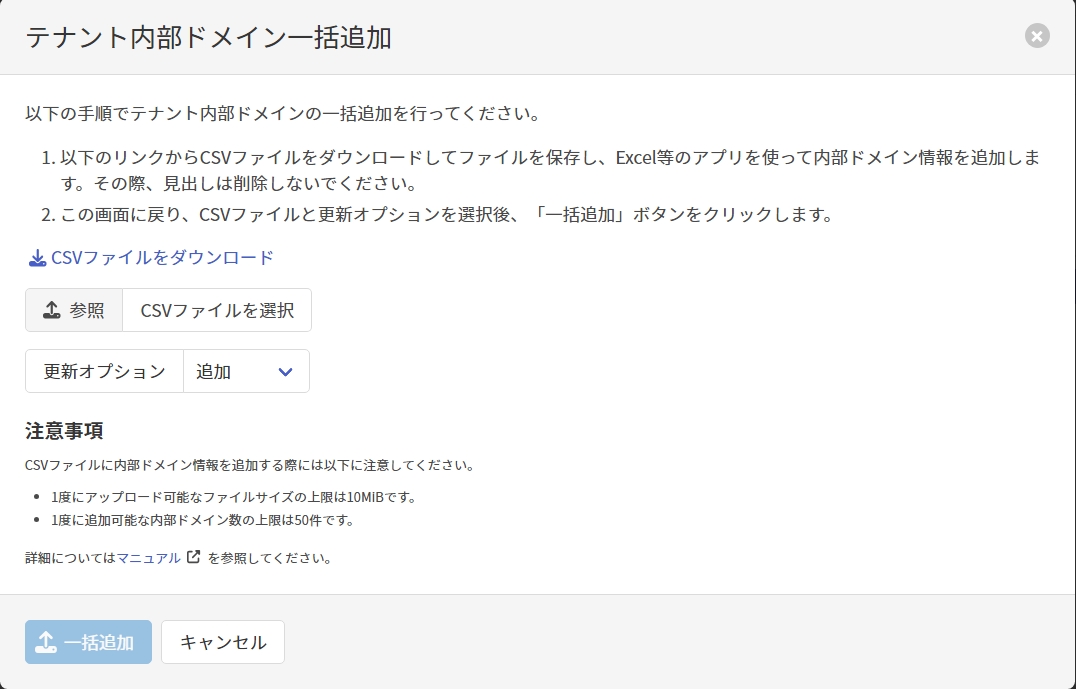 | CSVファイルを選択 | [CSVファイルをダウンロード]リンクをクリックしてダウンロードしたCSVファイルに内部ドメイン情報を追加したものを選択します。 CSVファイルのフォーマットは一括追加で使用するCSVファイルのフォーマットを参照してください。 |