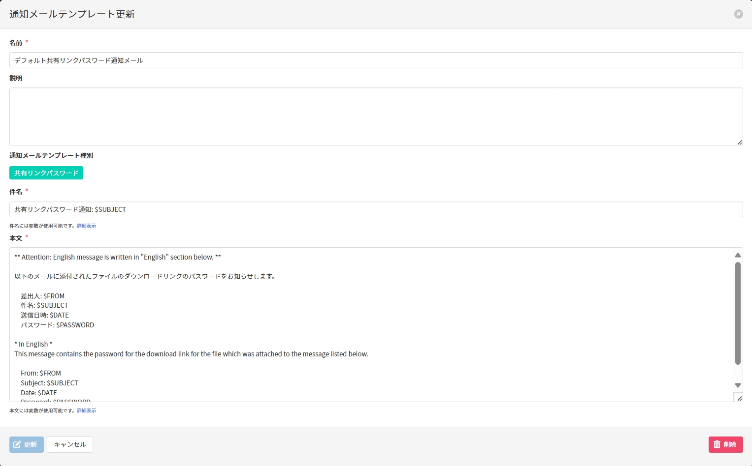 通知メールテンプレート更新画面で以下の項目を入力し、[更新]をクリックして通知メールテンプレートを更新します。