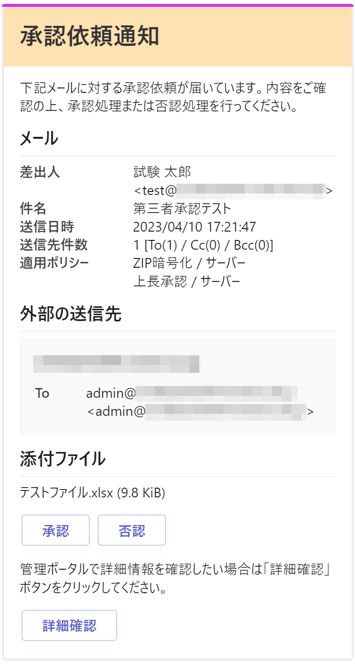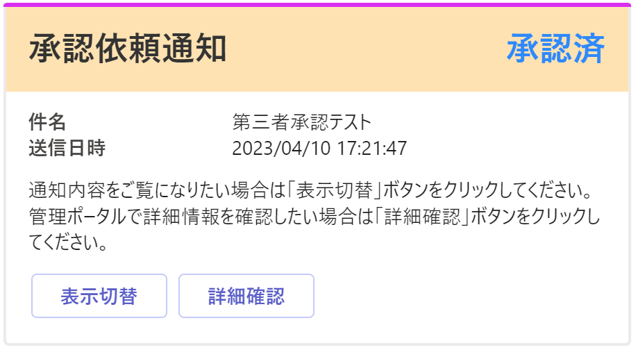 | 操作 | 本文内の管理ポータルを表示ボタンをクリックすると、ブラウザで管理ポータルの第三者承認依頼詳細画面が開きます。メールが承認・否認済みの場合は第三者承認履歴詳細画面が開きます。 |