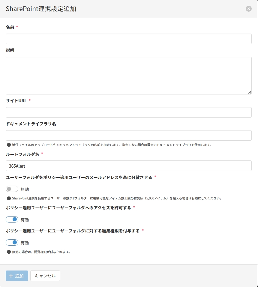 SharePoint連携設定追加画面で以下の項目を入力し、[追加]をクリックしてSharePoint連携設定を追加します。