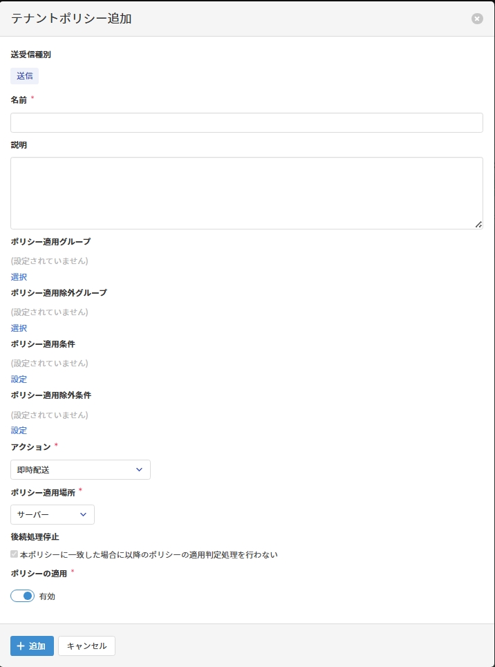 ポリシー追加画 面で以下の項目を入力し、[追加]をクリックしてポリシーを追加します。