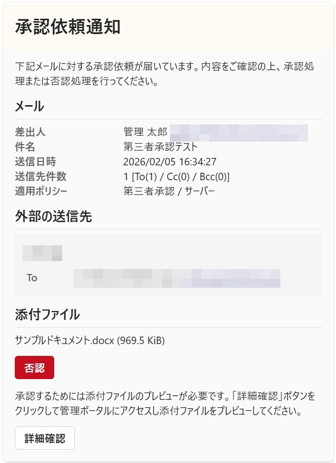 例えば、いずれかの送信先アドレスドメインが外部ドメイン(条件)の場合に上司CC(アクション)を実行する、等です。