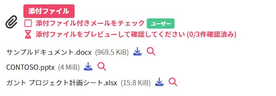 | 添付ファイルのプレビューを必須とする | 送信保留時に添付ファイルのプレビューを必須とする場合は、チェックボックスにチェックを入れてください。チェックを入れた場合、送信保留時に保留メール詳細画面・送信Alert画面で以下の表示となります。![]() ※添付ファイルがプレビューできない場合はダウンロードを必須とします。 |