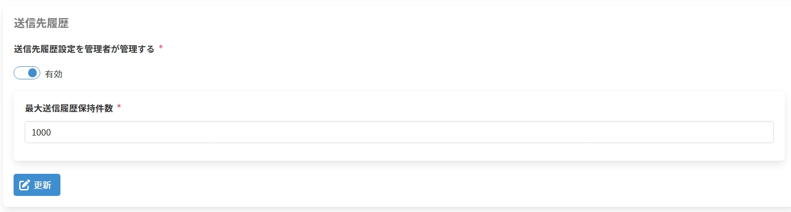 1. 以下の項目を入力し、[更新]をクリックして送信先履歴設定を更新します。