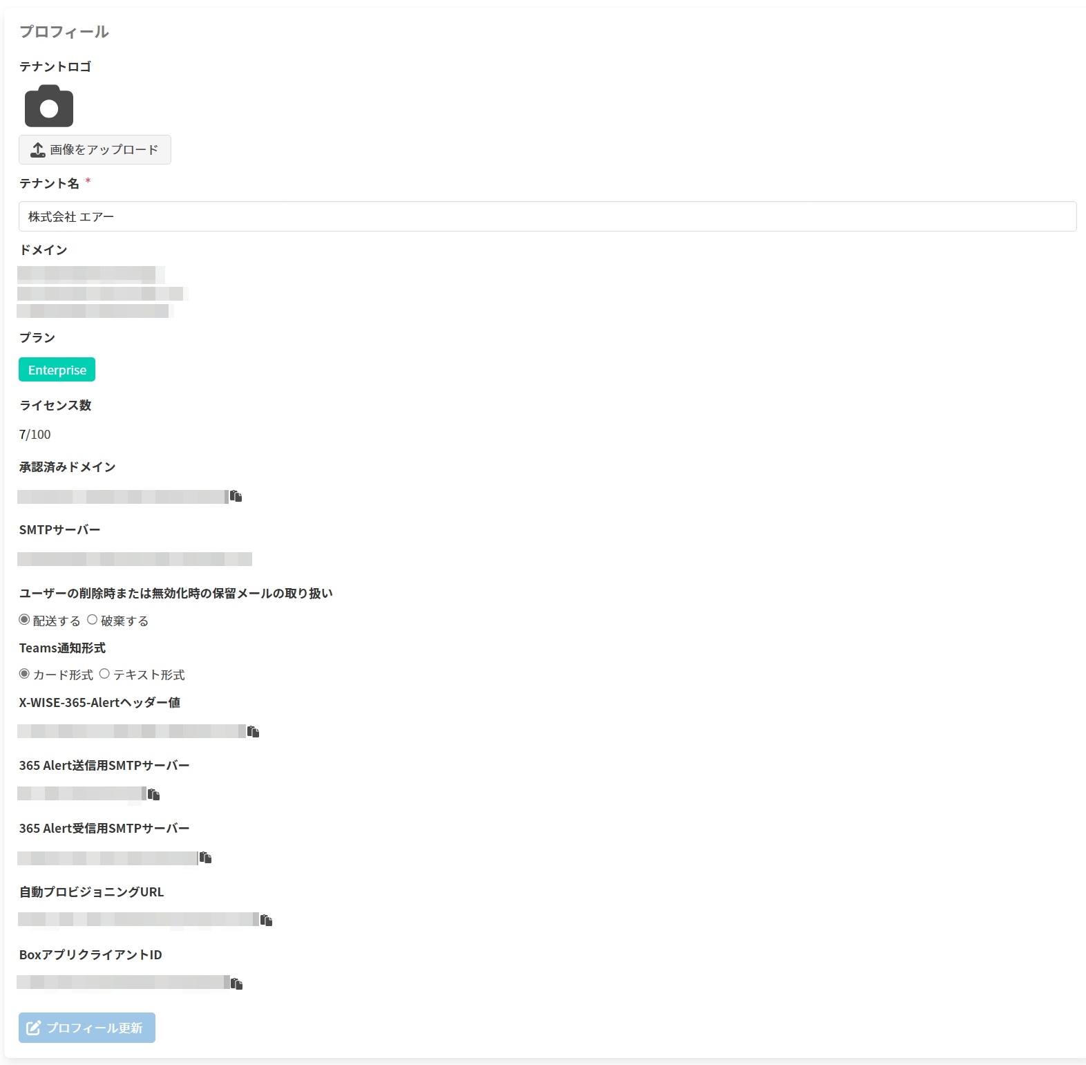以下では、テナントプロフィール画面の[プロフィール]セクションで可能な操作について記載します。