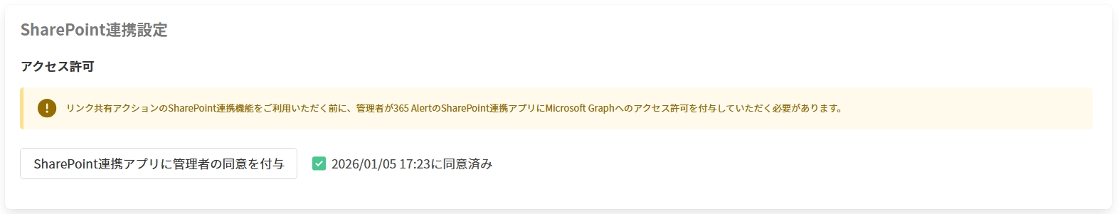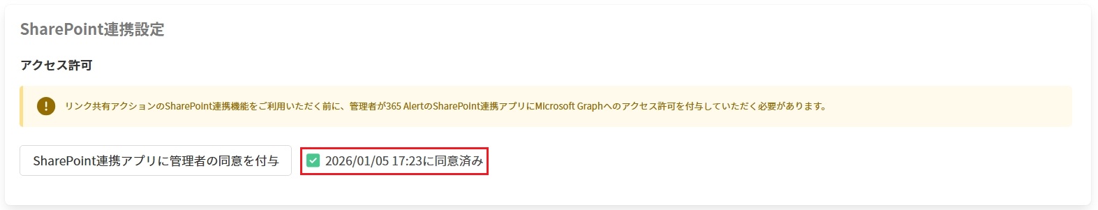 再度テナントプロフィール画面が表示されますので、[SharePoint連携設定]で、「yyyy/MM/dd HH:mmに同意済み」(yyyy/MM/dd HH:mmは同意を付与した日時)と表示されていることを確認します。
