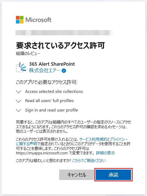 以下の画面で、[承諾]をクリックしアクセス許可を付与します。
