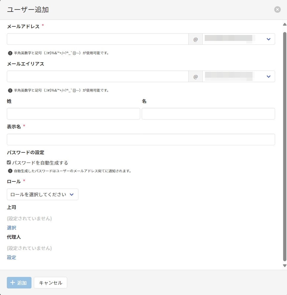 ※ [パスワードを自動生成する]にチェックを付けなかった場合は必須項目です。ロール必須 こちらを参照してロールを指定します。 上司 こちらを参照して上司を指定します。 代理人 こちらを参照して代理人を指定します。 -