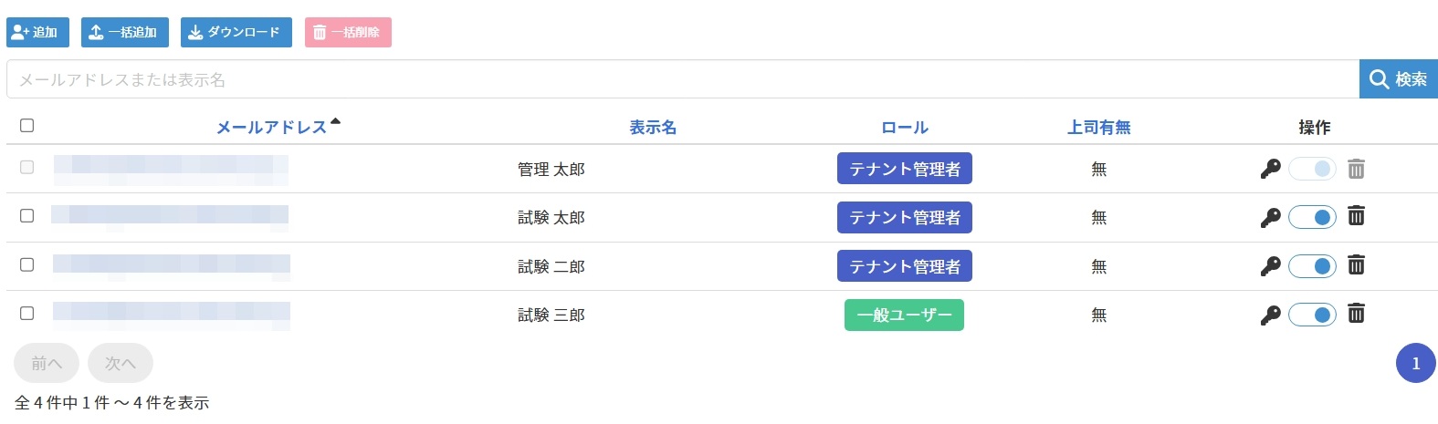 検索ボックスにキーワードを入力し[検索]をクリックすると、メールアドレスまたは表示名に部分一致するユーザーのみをフィルタリングすることができます。
