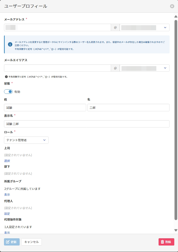 ユーザー更新画面で[削除]をクリックしてユーザーを削除します。